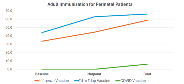 Following Dr. Bratberg’s presentation, each participating practice shared updates on their quality improvement efforts, presenting data and lessons learned through their Plan-Do-Study-Act (PDSA) cycles. The session provided a collaborative space for shared learning, innovation, and ongoing commitment to improving adult immunization rates. Charts A and B below illustrate practice performance in immunizing patients with diabetes and perinatal patients, while Chart C highlights pre- and post-program performance across key immunization measures. Overall, practices demonstrated significant improvement throughout the course of this initiative.