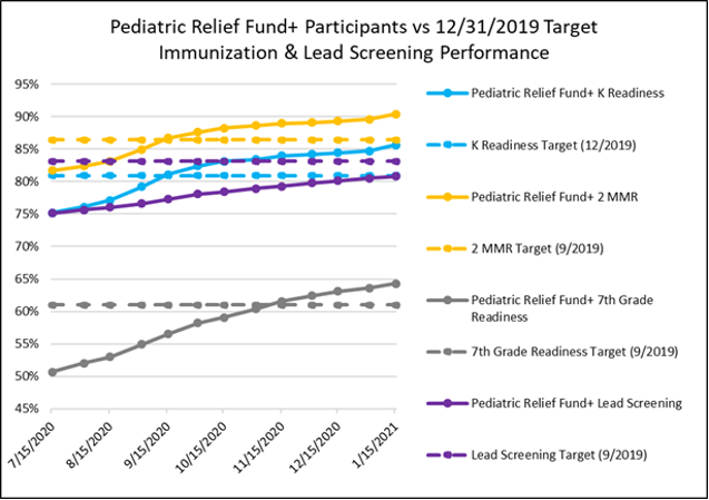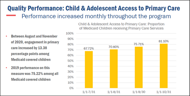 In addition, EOHHS implemented the Medicaid Pediatric Primary Care Rate Supplement program through the end of calendar year 2020, to provide monthly financial incentives to pediatric primary care practices to ensure all children are up to date with the full array of essential, preventive healthcare services by overcoming COVID-19 related barriers to access. This group worked hard to improve Medicaid Access to Care performance, resulting in $3 million total funding provided to participating practices. Here is the group’s performance overtime. Outstanding performance!